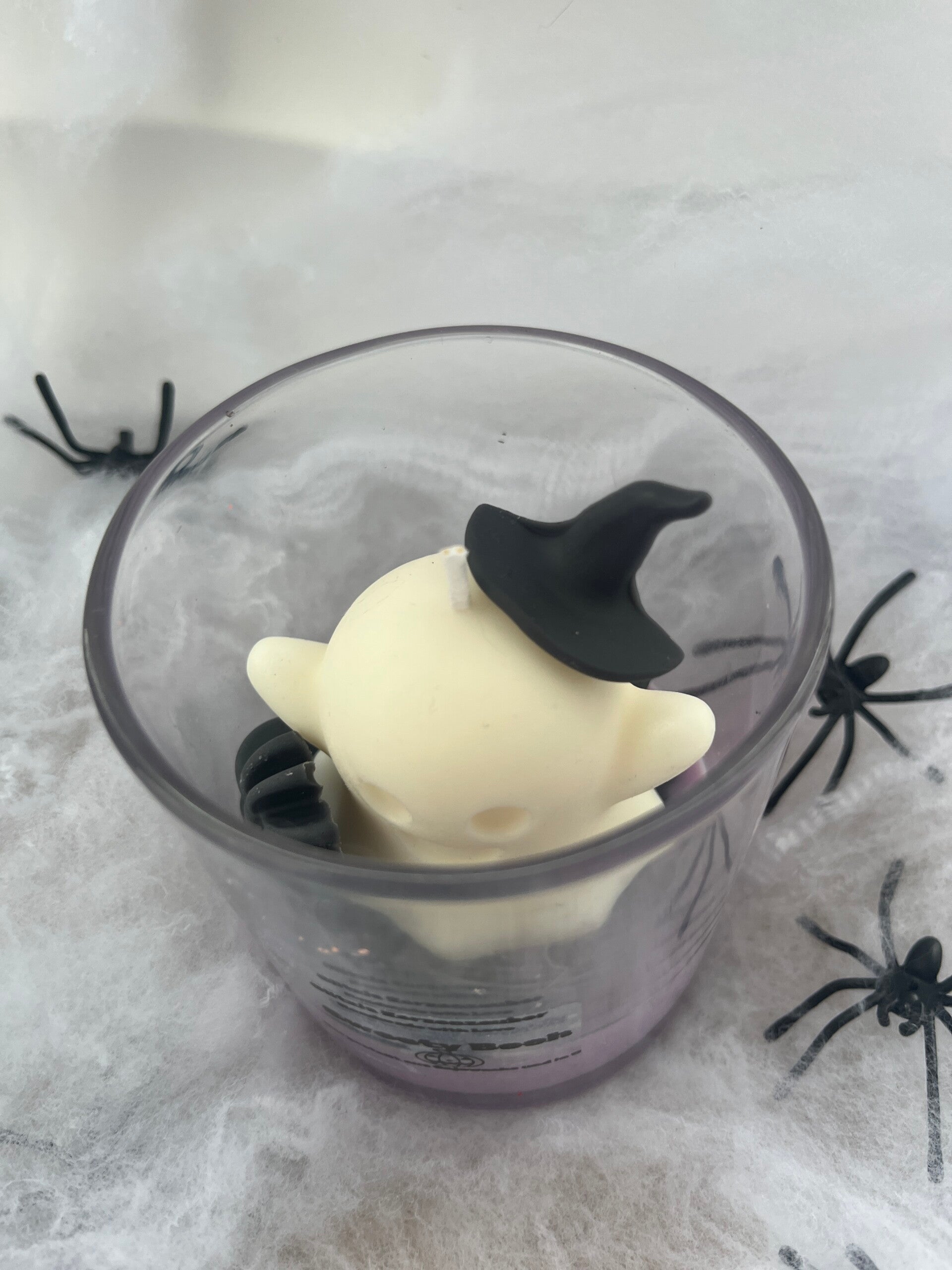Diese handgefertigte Kerze bringt magische Stimmung in dein Zuhause! Im Glas sitzt ein süßer kleiner Geist, der von schwarzen Halloween-Details wie Hexenhut und Kürbis begleitet wird ..ein echtes Highlight für die spooky Season.