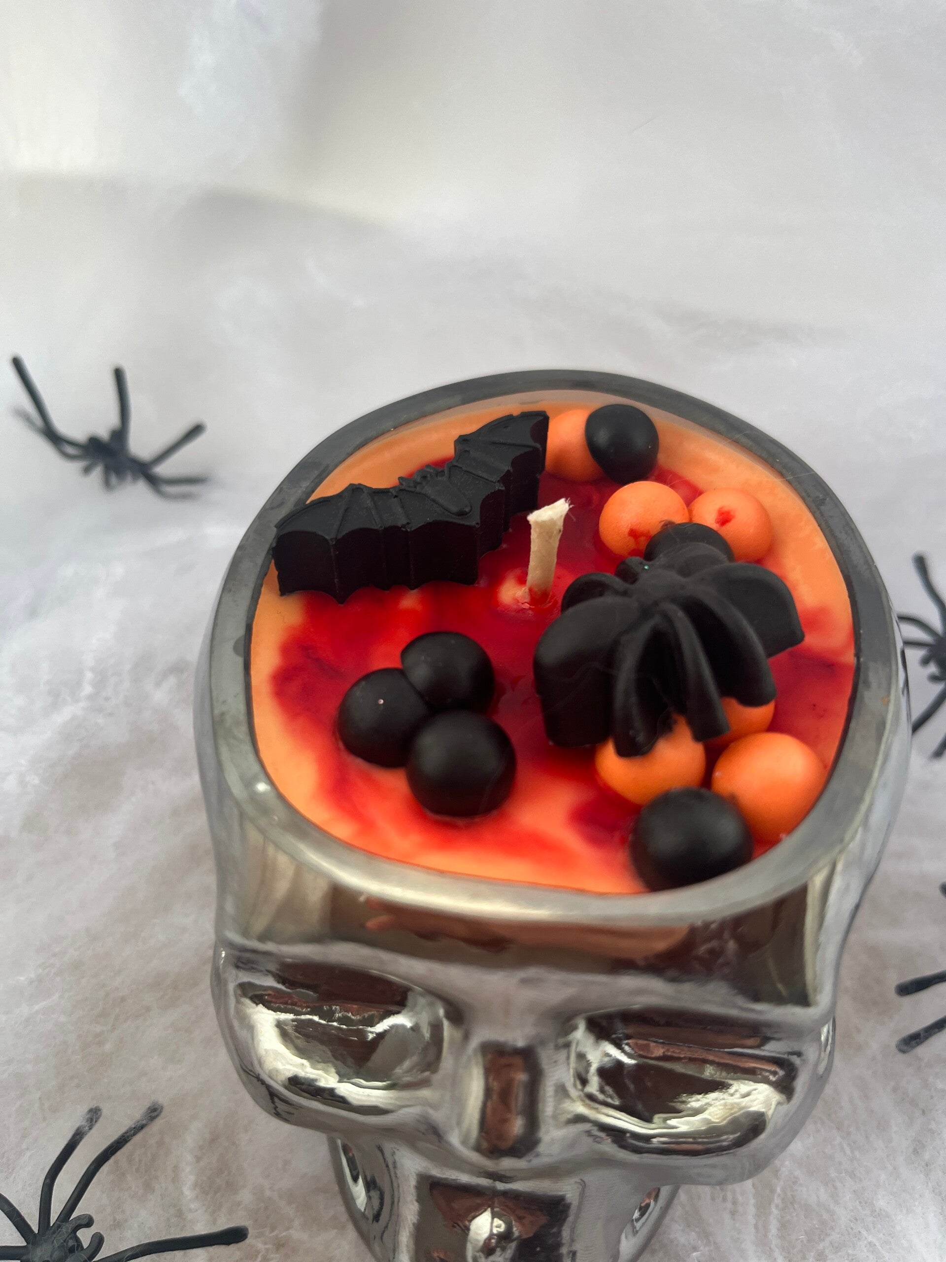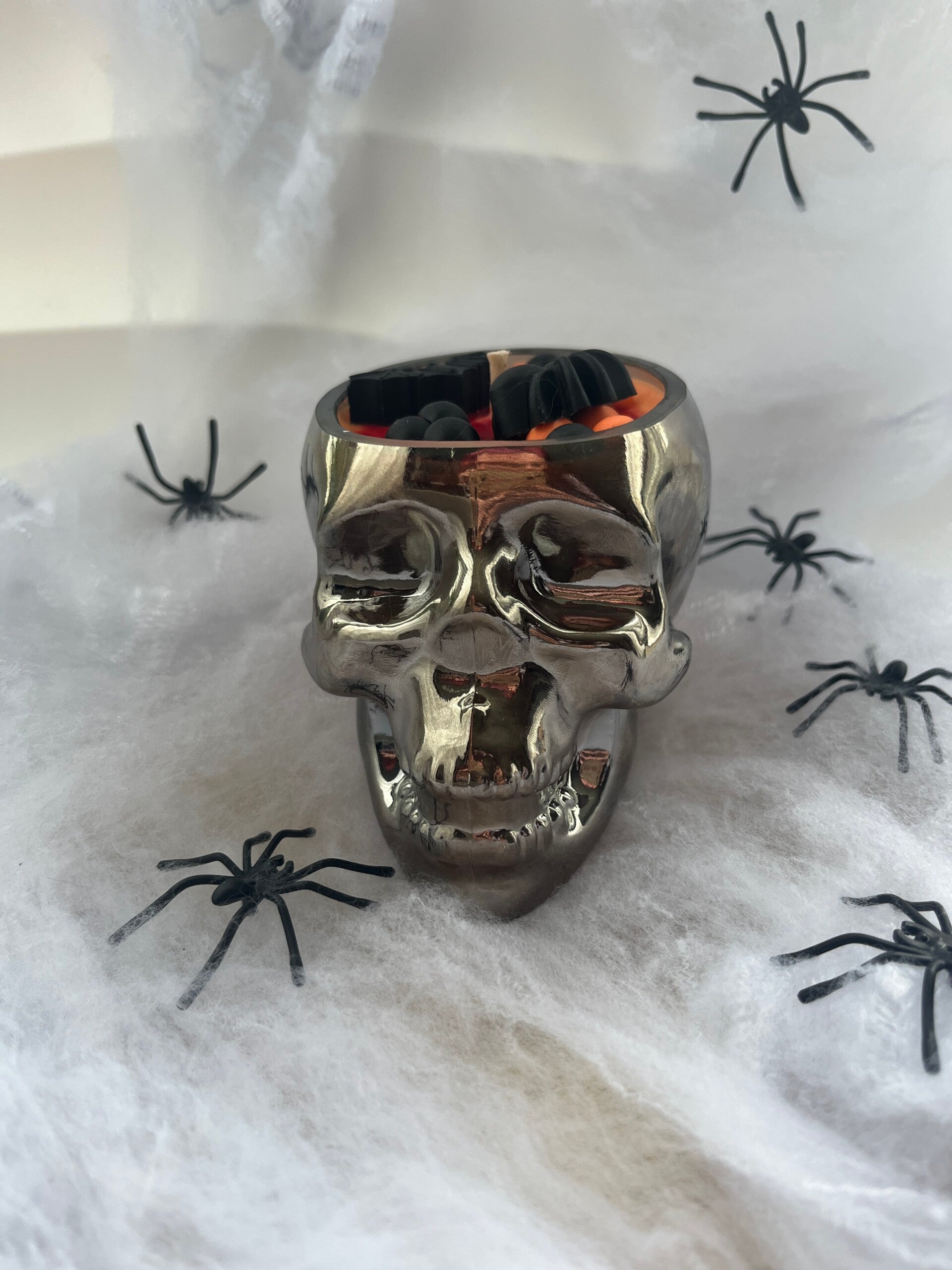 Diese handgefertigte Kerze ist ein echter Blickfang: gegossen in einem silbernen Totenkopf-Glas, dekoriert mit detailreichen Elementen wie Schädel, Spinne, Fledermaus und Kugeln in Schwarz und Orange.Ein Must-have für alle, die es düster, mystisch und außergewöhnlich lieben.