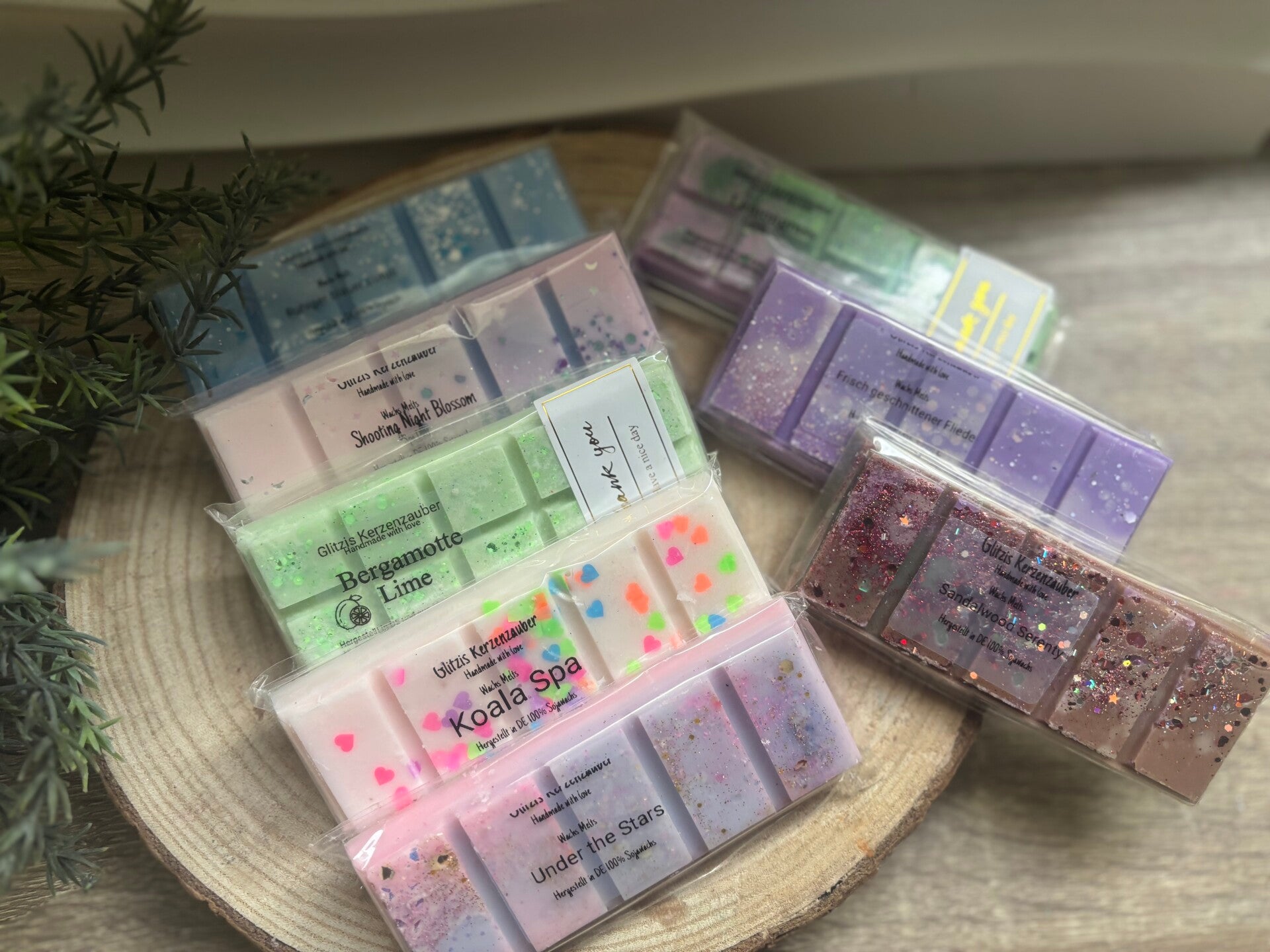 Meine handgemachten Wax Melts sind nicht nur ein Dufterlebnis, sondern auch kleine Kunstwerke voller Glitzer und Farbe. Jeder Duft erzählt seine eigene Geschichte und bringt eine besondere Stimmung in dein Zuhause: