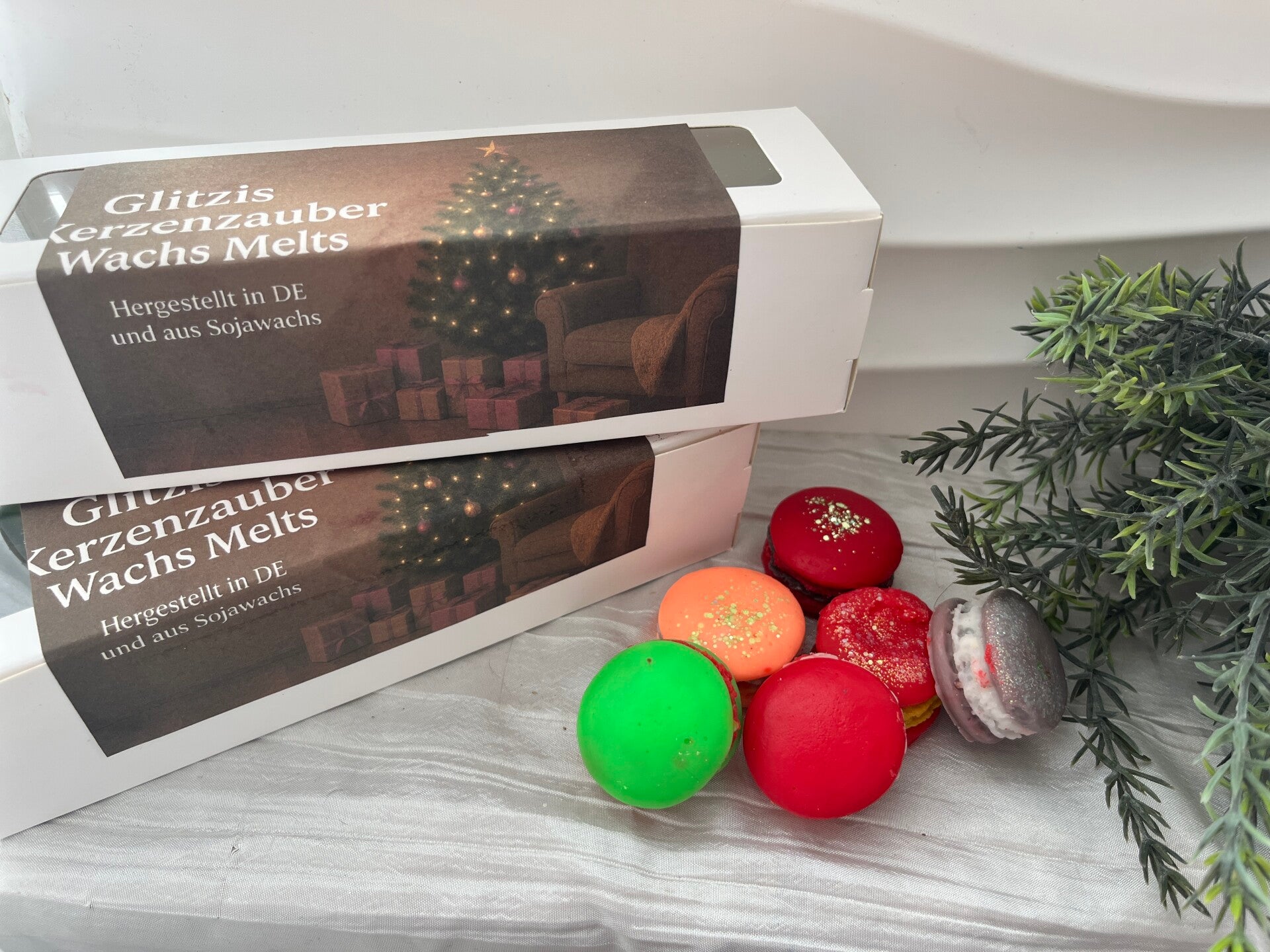 Hier findest du eine Weihnachtsbox mit 6 verschiedenen Macaron Wachs Melts. 6 verschiedene Düfte mit den du dich verzaubern kannst.
