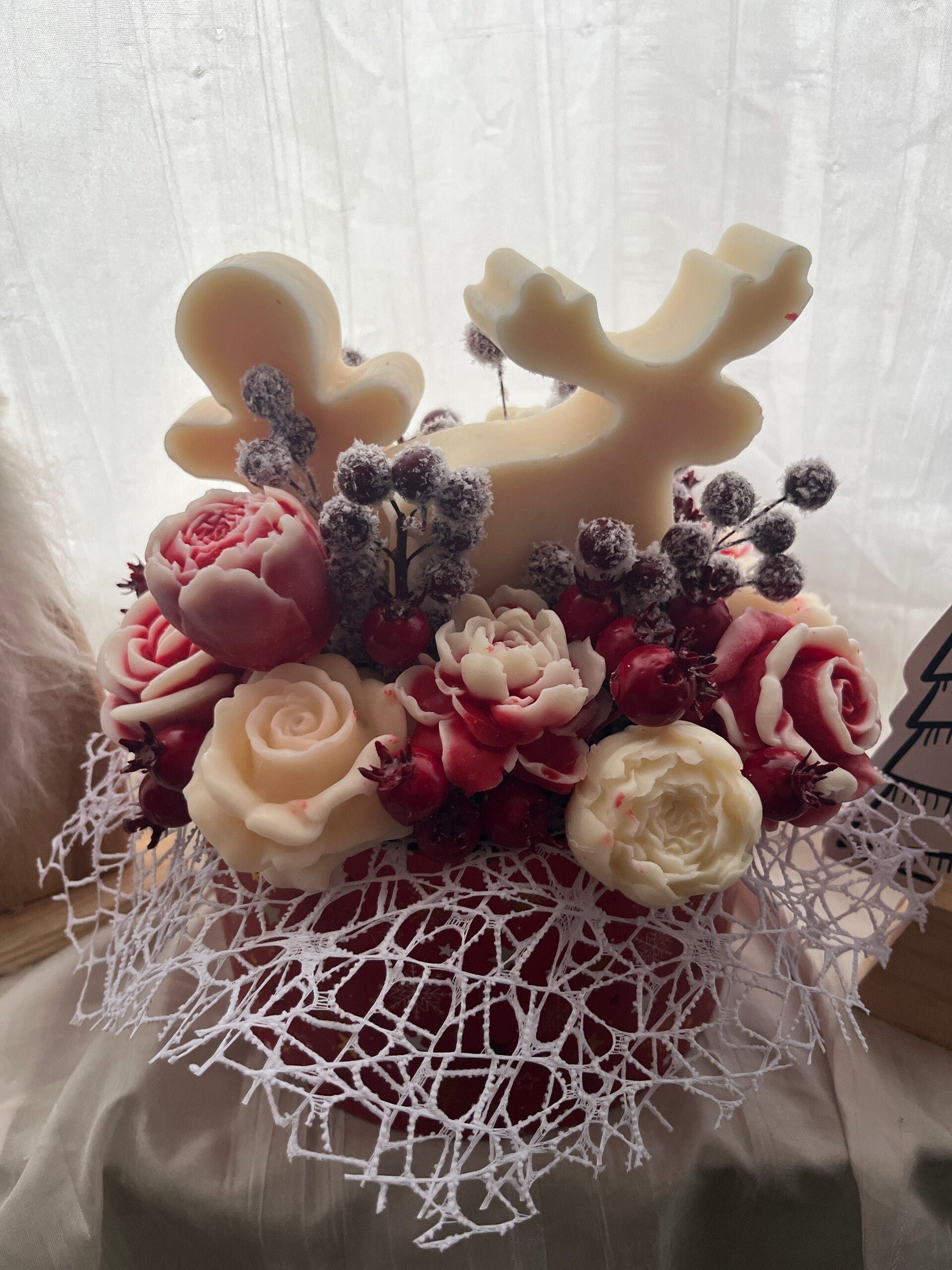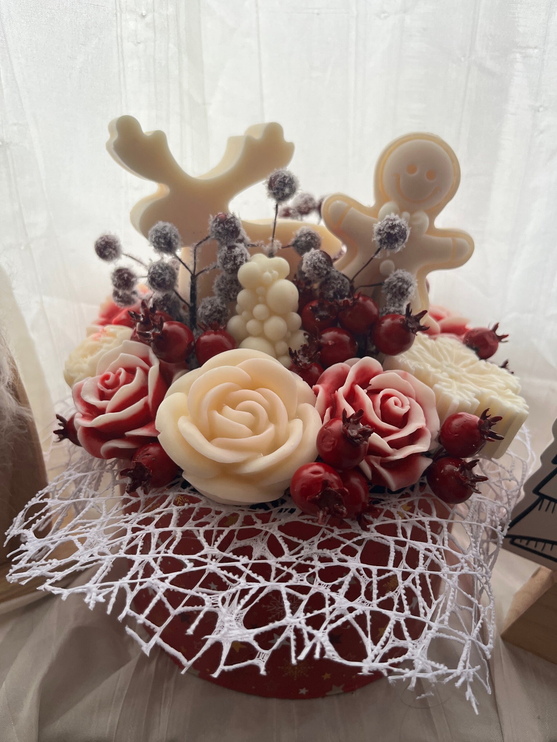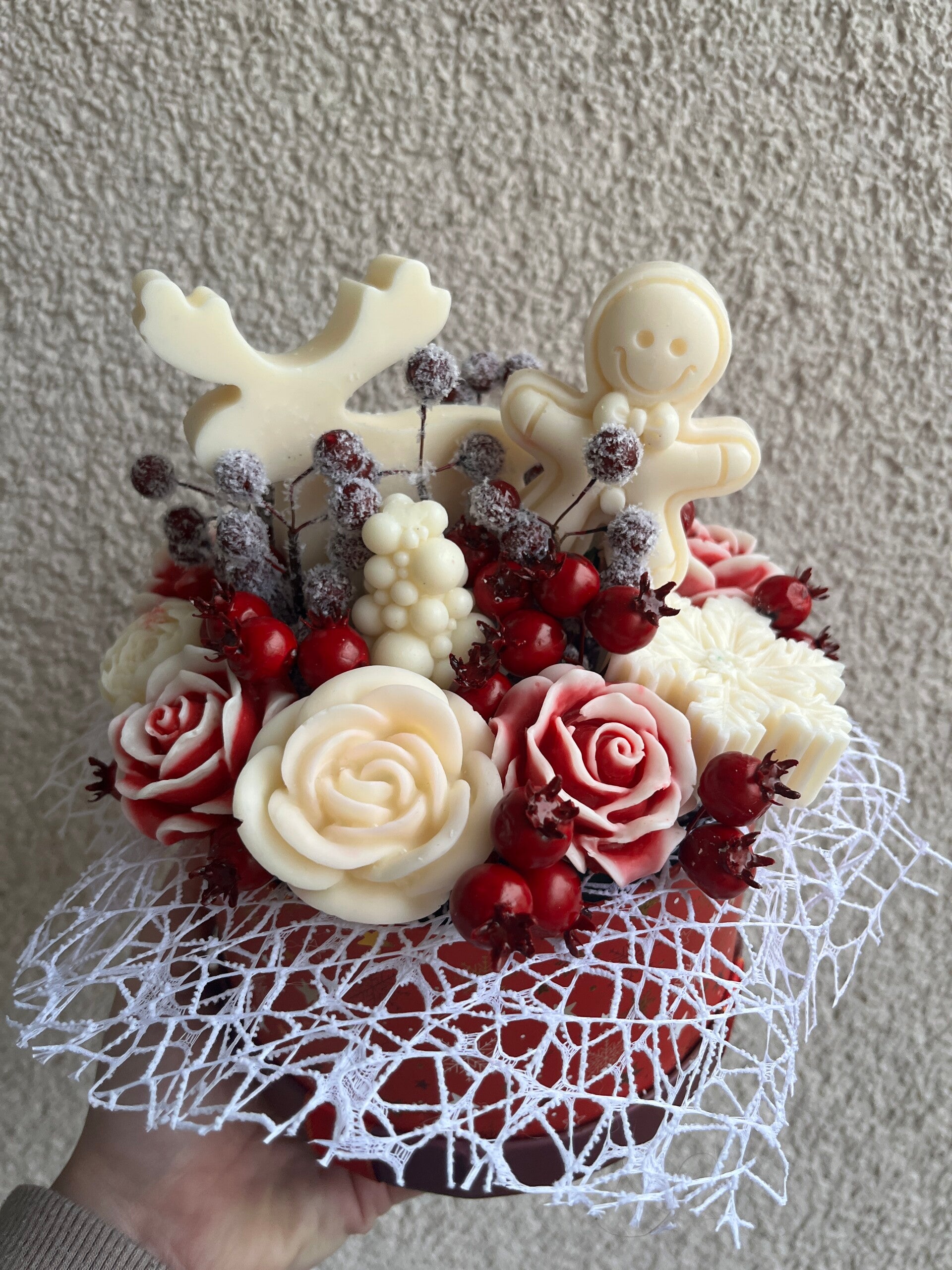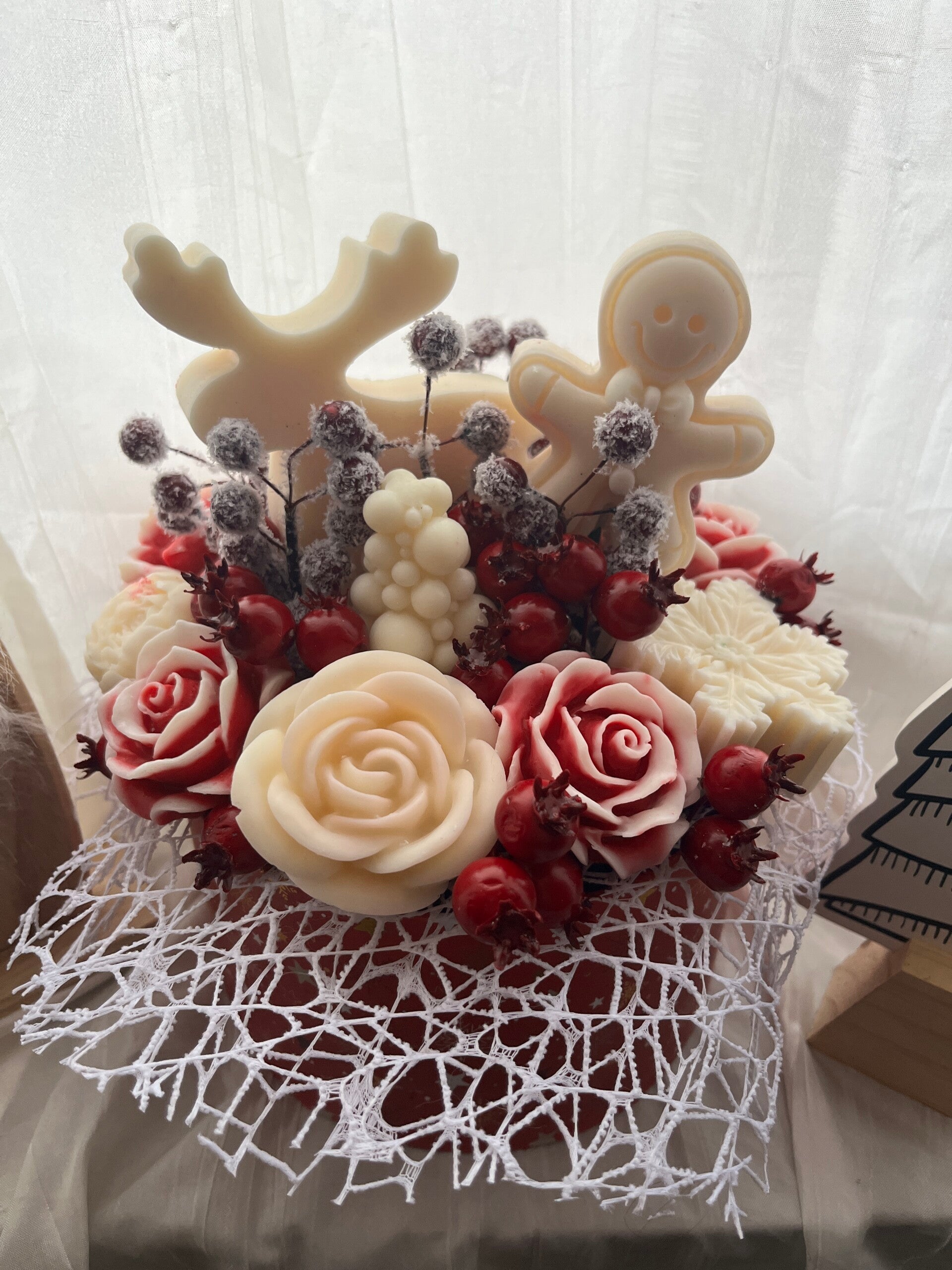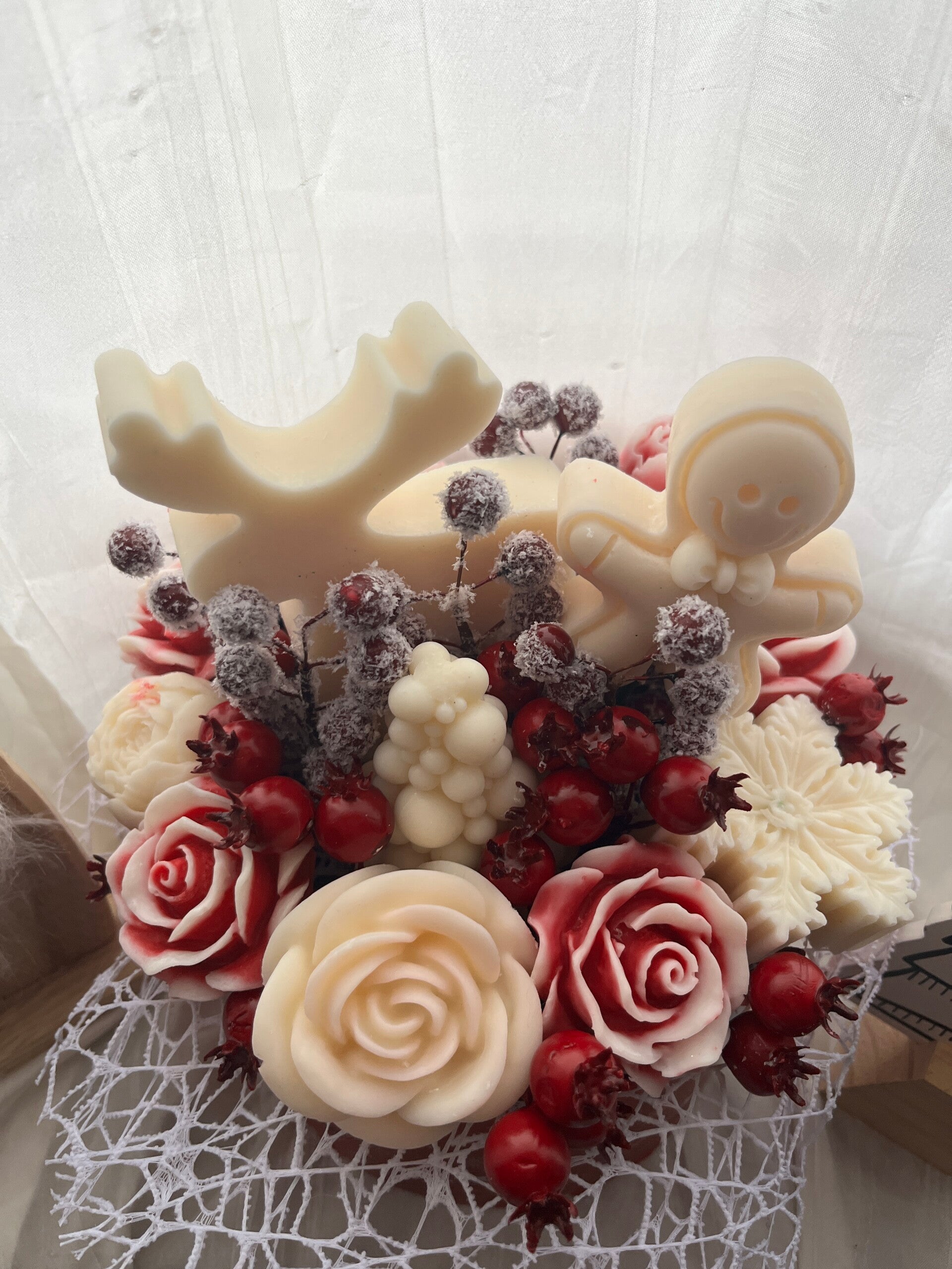 Dieser liebevoll gestaltete Blumenstrauß aus Wachs vereint festliche Eleganz mit wohligem Winterduft. Handgefertigte Wachsblumen, winterliche Beeren und weihnachtliche Figuren machen ihn zu einem besonderen Highlight für die Advents- und Weihnachtszeit.