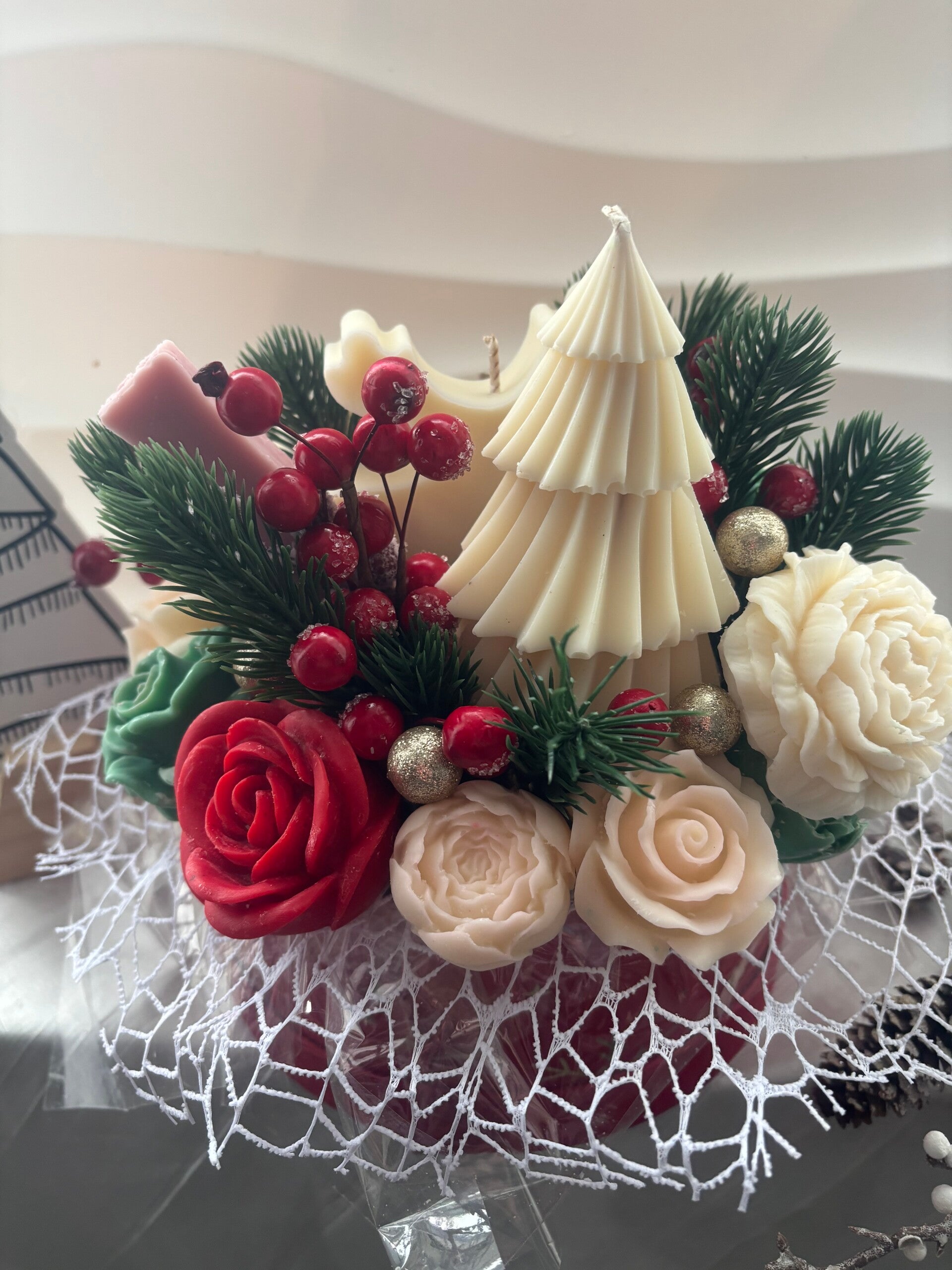 Dieser liebevoll gestaltete Blumenstrauß aus Wachs vereint festliche Eleganz mit wohligem Winterduft. Handgefertigte Wachsblumen, winterliche Beeren und weihnachtliche Figuren machen ihn zu einem besonderen Highlight für die Advents- und WeihnachtszeiT.