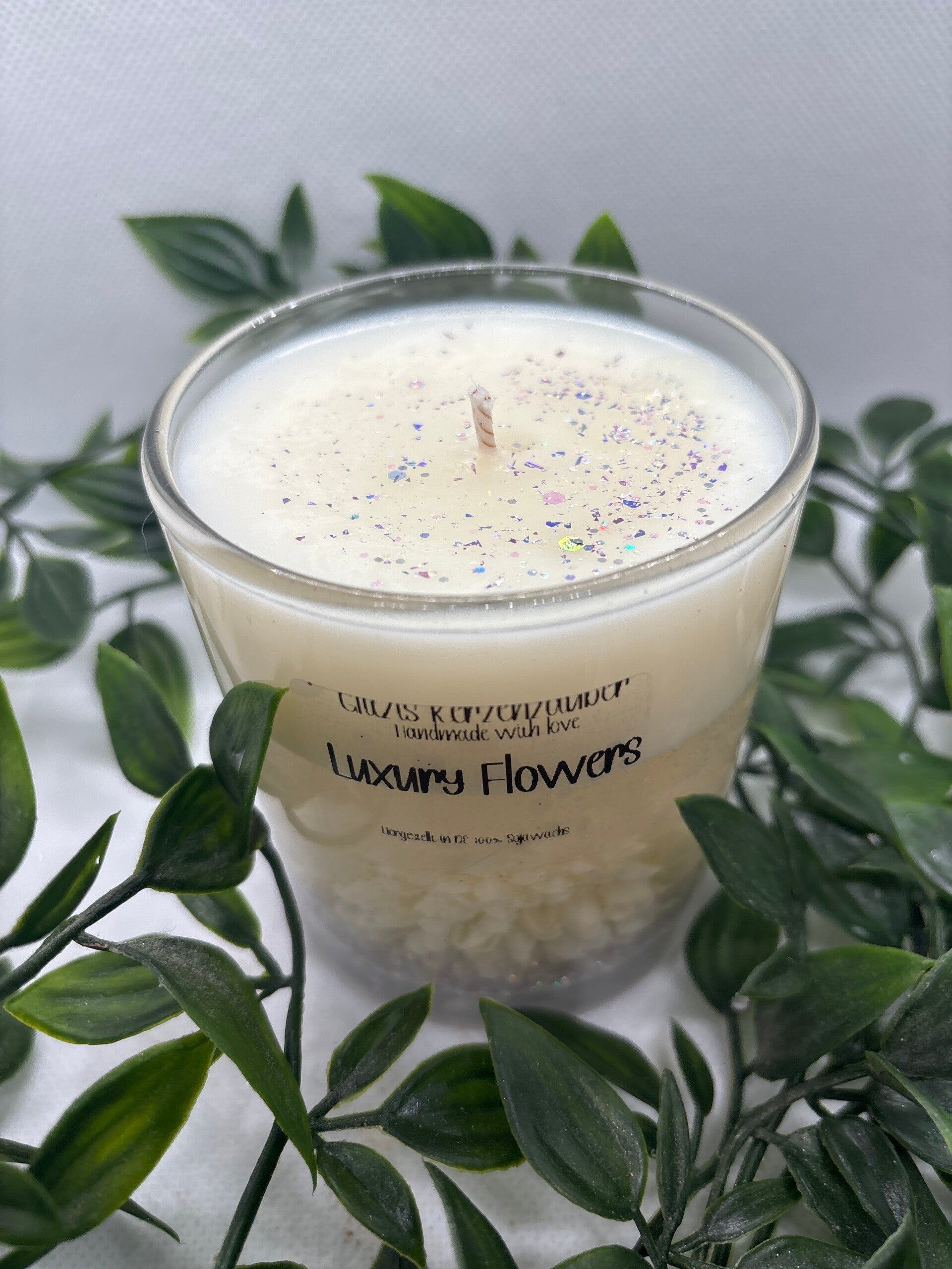 Diese Kerze ist etwas richtig besonderes! Sie riecht nicht nur super gut, sondern sieht auch sehr hochwertig aus. Die unzere Schicht besteht aus Glitzer und oben drauf eine Blume eingearbeitet. Mit Gelwachs versiegelt. Oben eine brennbare Schicht Sojawachs.