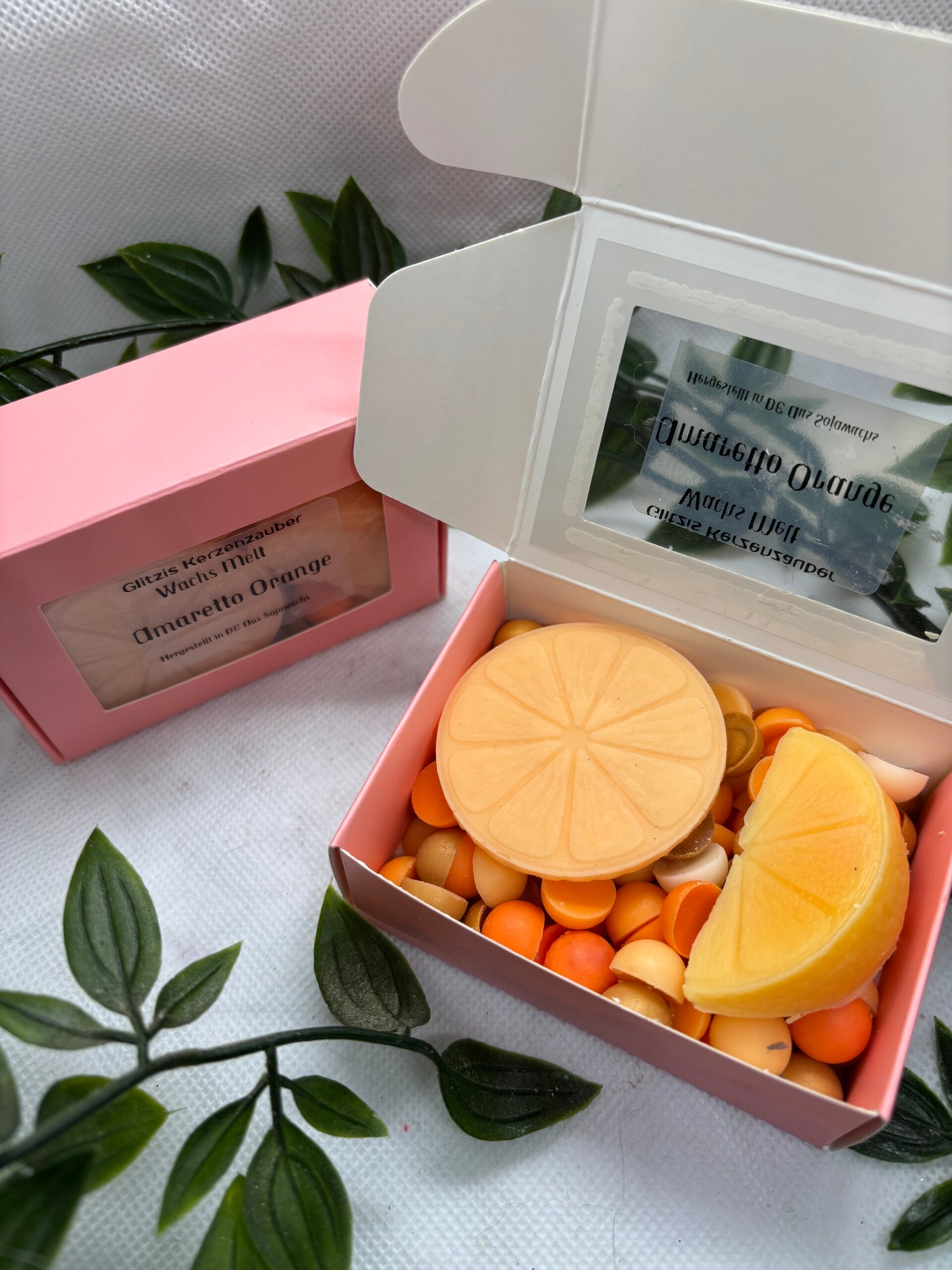 Duftwachs „Amaretto Orange“ sorgt für einen warmen, süß-fruchtigen Raumduft und wird in einer Duftlampe geschmolzen. Dabei verströmt es eine Mischung aus nussigen Amaretto-Noten und frischer Orange, die eine gemütliche Atmosphäre im Raum schafft.