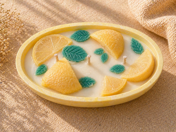 Diese handgegossene Duftkerze überzeugt mit ihrem sommerlichen Zitronen-Design und bringt sofort frische, leichte Stimmung in dein Zuhause. Die detailreichen Zitronenscheiben und Blätter machen sie zu einem echten Hingucker.